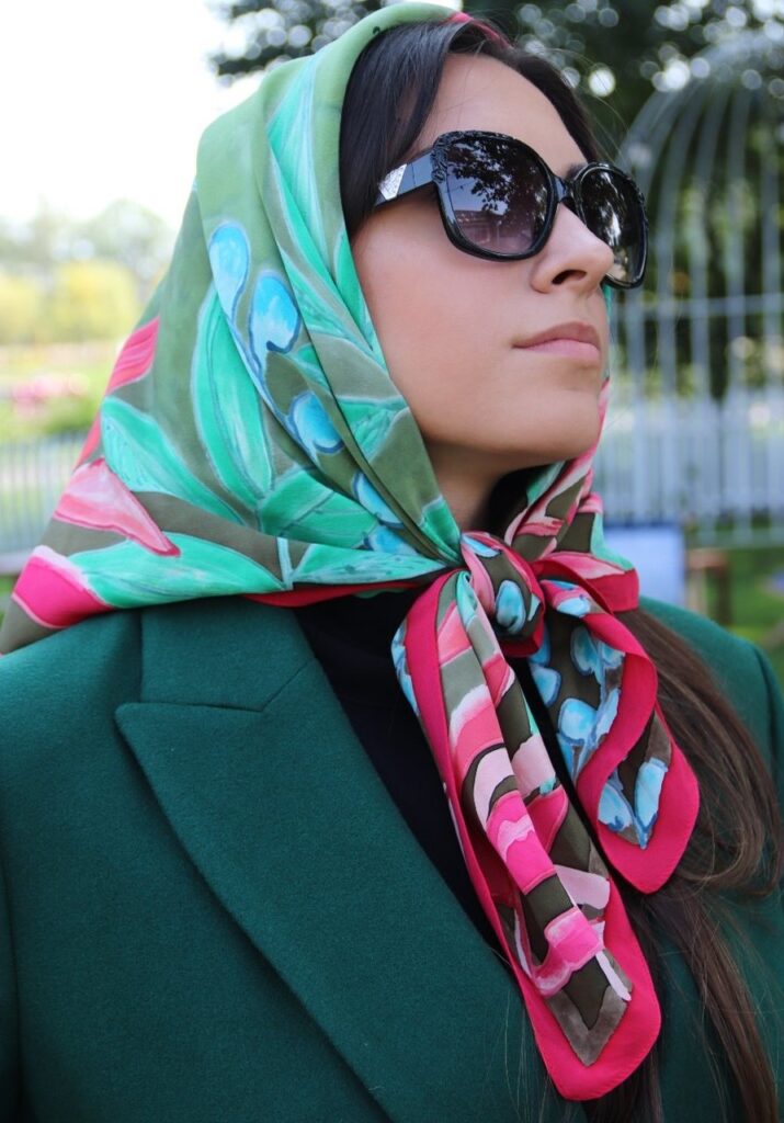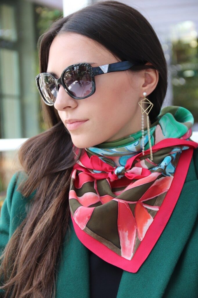 Wielobarwne apaszki ręcznie malowane ciekawie i oryginalnie wyglądają zawiązane na kokardę. Możesz także wykonać ciasne wiązanie apaszki pod szyją w taki sposób, by pozostawić jak najkrótsze końce.